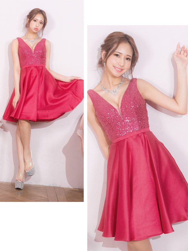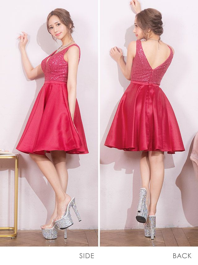 5. [LA直輸入] キラキラスパンコールノースリーブ切り替えサテンフレアミニドレス (XSサイズ~Lサイズ) (天乃えま/キャバドレス着用)