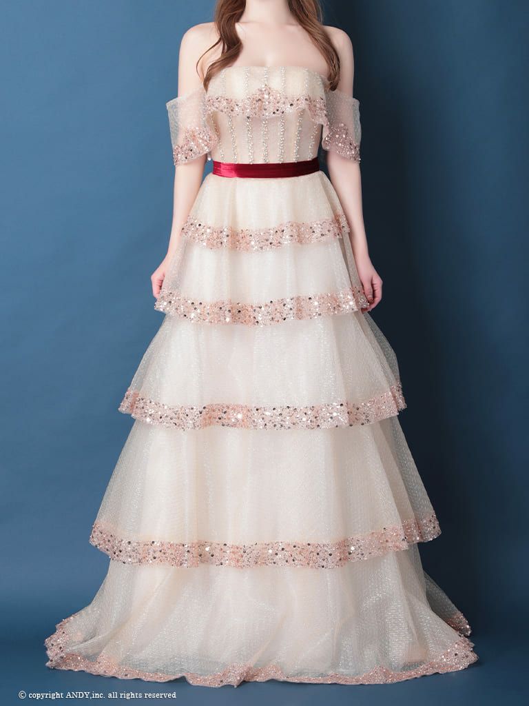 段になったフリルがエレガント★ [couture an/クチュールアン] 高級 バースデー オフショルダー フリル ビジュー パール ラメ チュール Aラインロングドレス