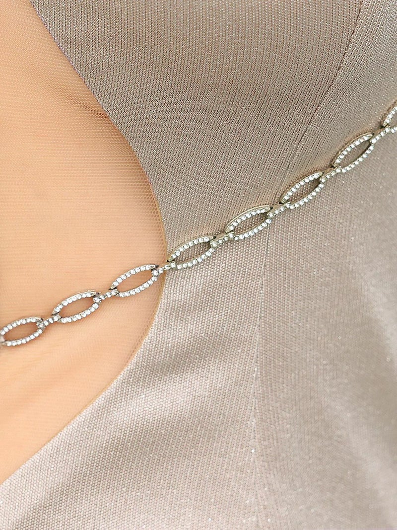 4. [Veautt/ヴュート] 高級ラメノースリーブくびれビジューチェーンサイドメッシュタイト膝丈ドレス