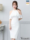 5. [Veautt/ヴュート] 高級 肩出し 二の腕カバー ホルターネック ワンカラー ファスナースリット タイト 膝丈ドレス