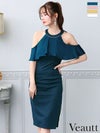 サイドジップで美脚アピール☆ [Veautt/ヴュート] 高級 肩出し 二の腕カバー ホルターネック ワンカラー ファスナースリット タイト 膝丈ドレス