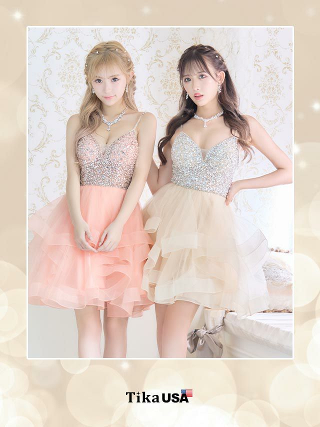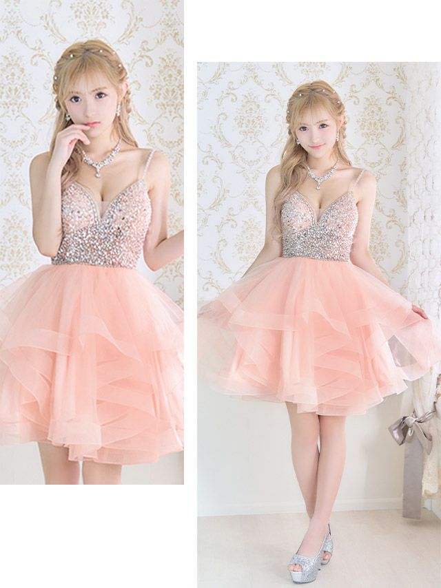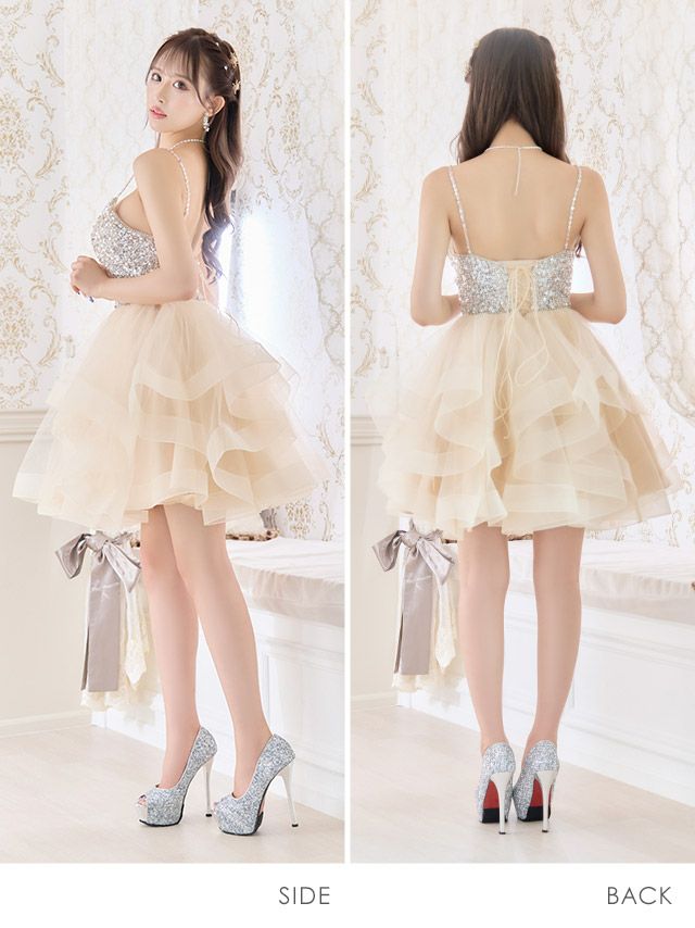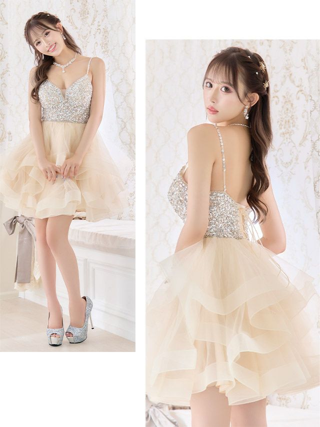 4. [LA直輸入] バックスピンドルキャミソールゴージャスビジュー切替ボリュームフレアミニドレス (XSサイズ/Sサイズ) (聖菜/キャバドレス着用)