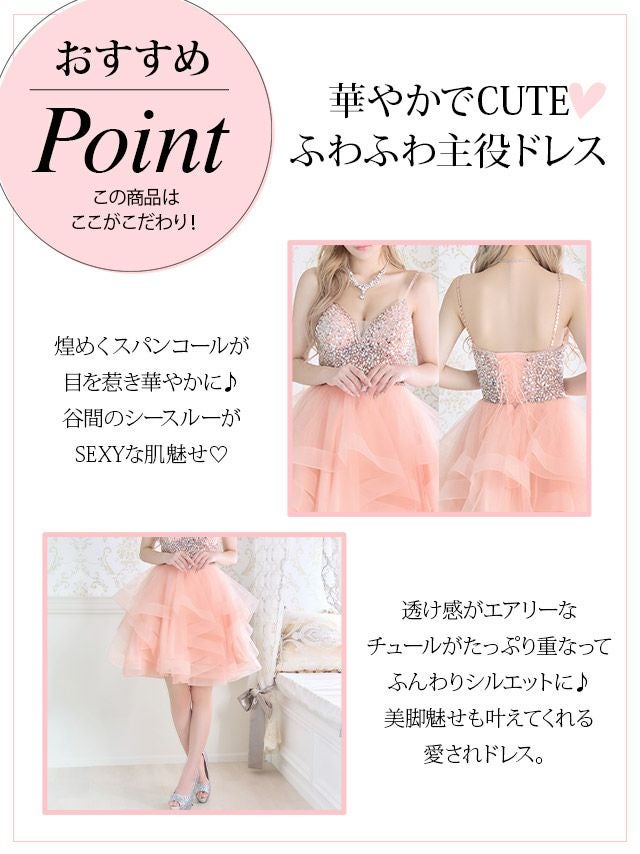 バックスピンドルキャミソールゴージャスビジュー切替ボリュームフレアミニドレスの商品特徴
