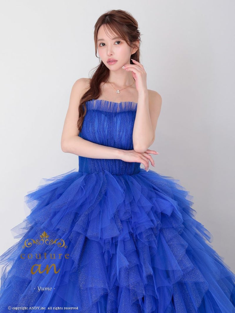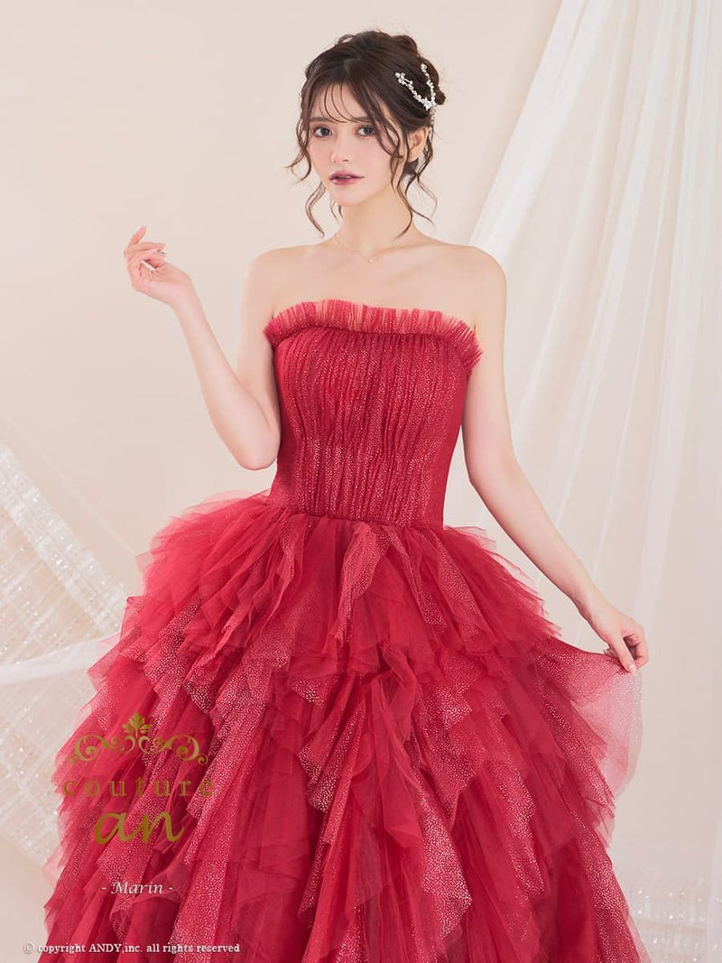 5. [couture an/クチュールアン] 高級 ブランド バースデー Aラインロングドレス ベアトップ ラメチュール フリルレース ゴージャス