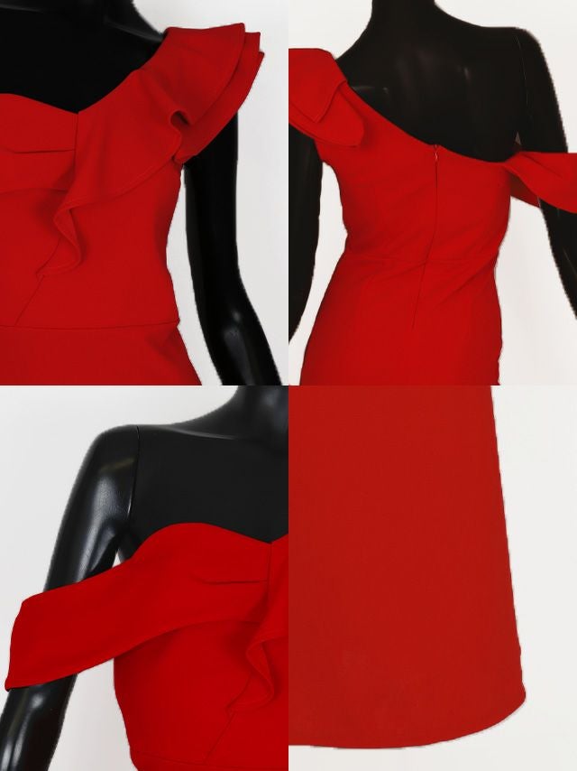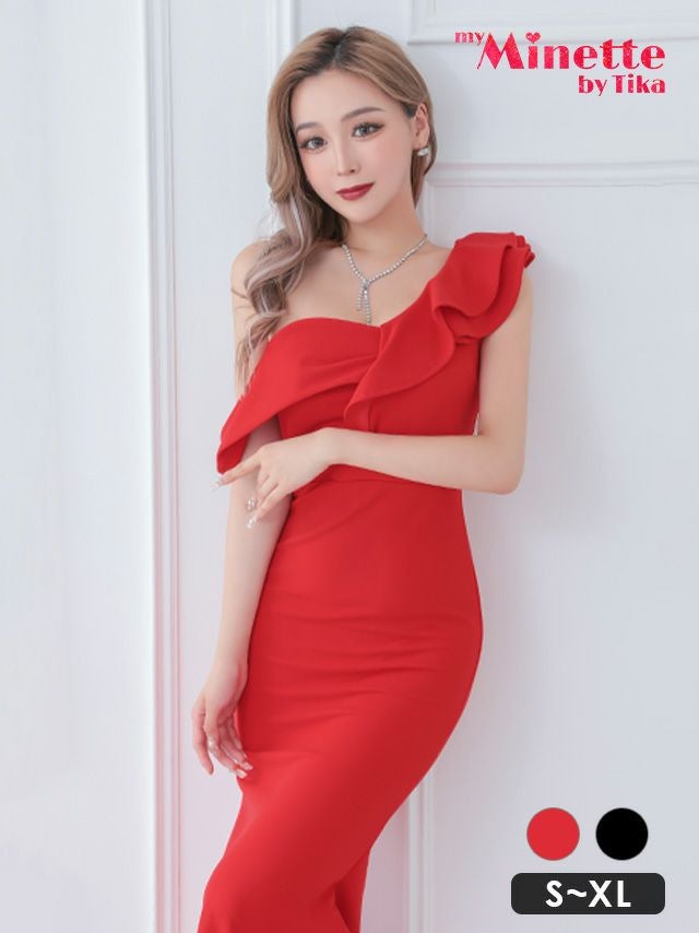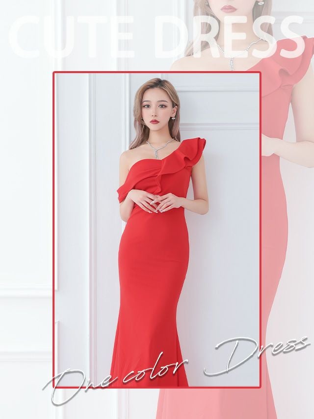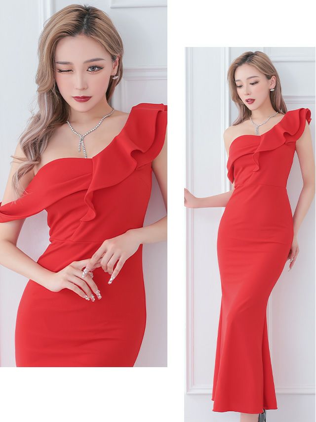 ワンショルダーフリルシンプルタイトロングドレス
