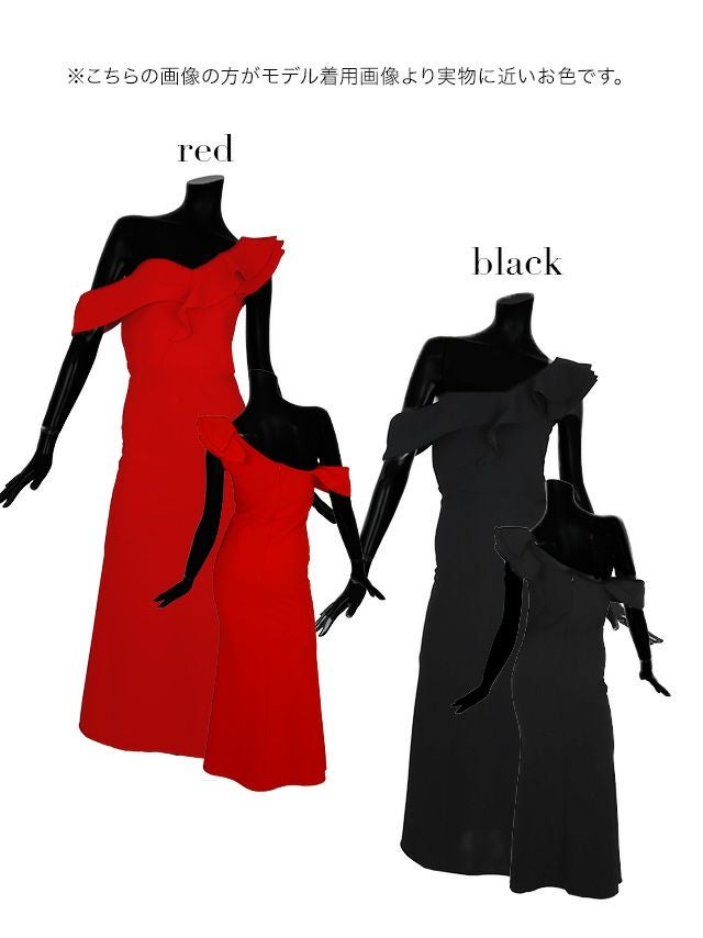 デコルテラインを美しく魅せる♪ 安い タイトロングドレス シンプル 大人 上品 背中魅せ マーメイド ワンショルダー バストフリル (せいせい着用)