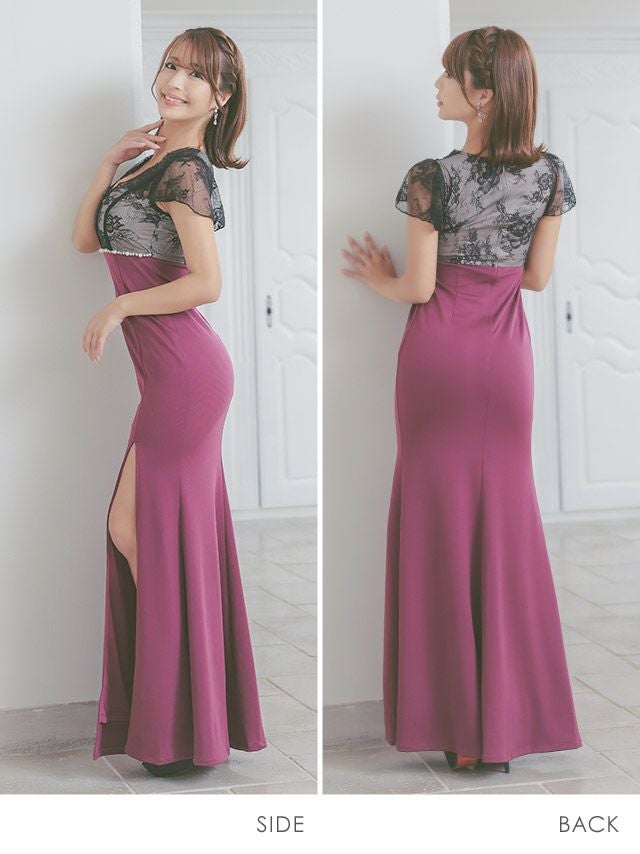スカラップレース切替ロングスリット半袖タイトロングドレスのサイドバッグ全身