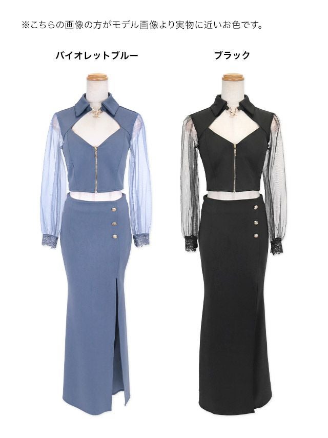 襟付き シアースリーブ 袖あり 長袖 バストカット ジップ 谷間見せ ワンカラー ストレッチ セットアップ スリット タイトロングドレスの商品特徴1