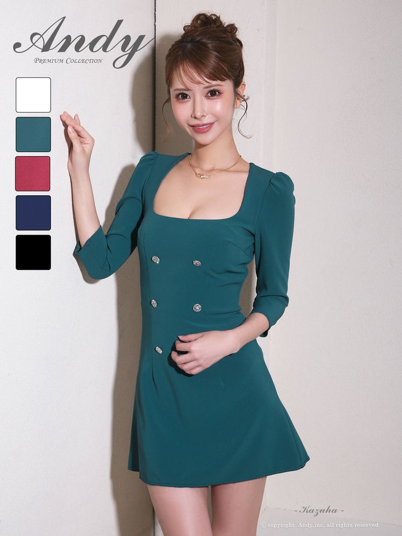 キャバドレス Andy アンディ 高級 ブランド ワンピース フレアミニドレス シンプル 七部袖 同伴 スクエアネック ワンカラー ボタン