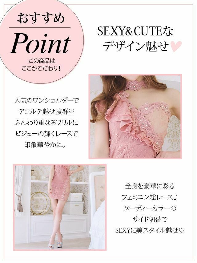 5. サイドシースルーチョーカーネック立体フラワー刺繍ビジューワンショルダータイトミニドレス (Sサイズ~Lサイズ) (浦西ひかる/キャバドレス着用)