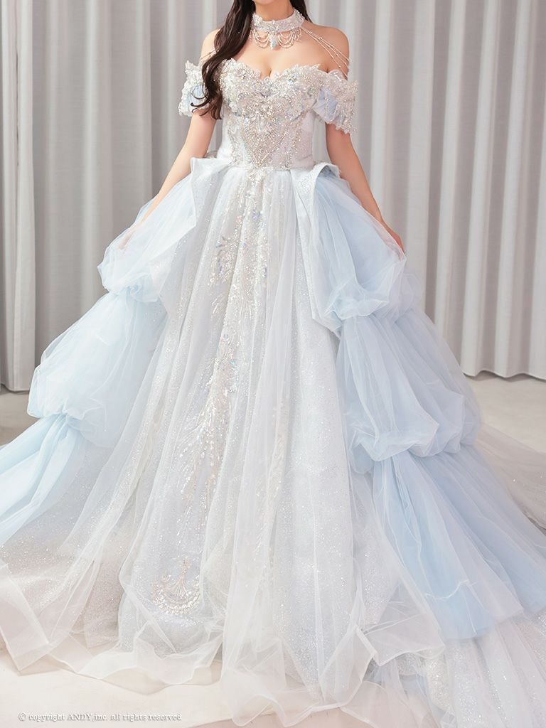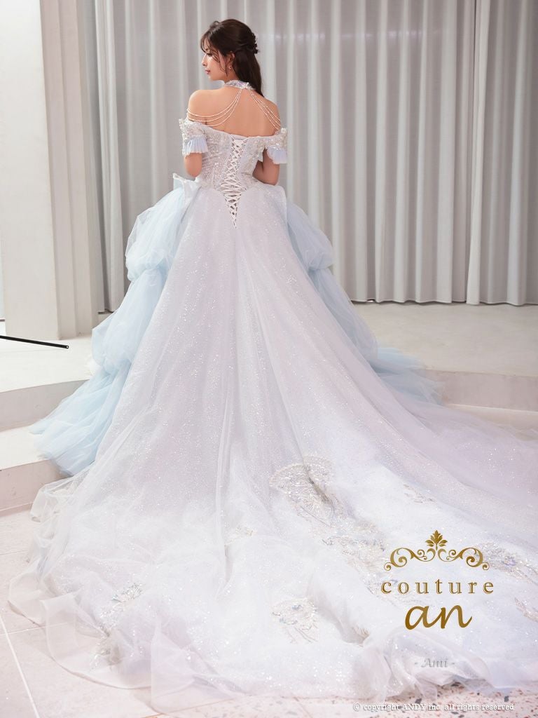プリンセス感抜群のバースデードレス☆ [couture an/クチュールアン] 高級 バースデー オフショルダー 半袖 レース ビジュー ラメチュール フリル 刺繍レース Aラインロングドレス