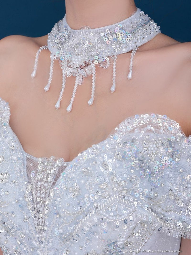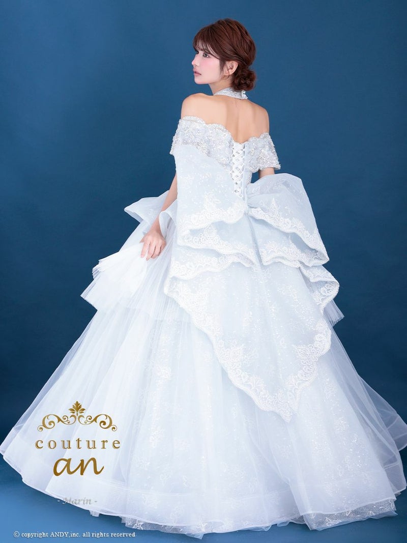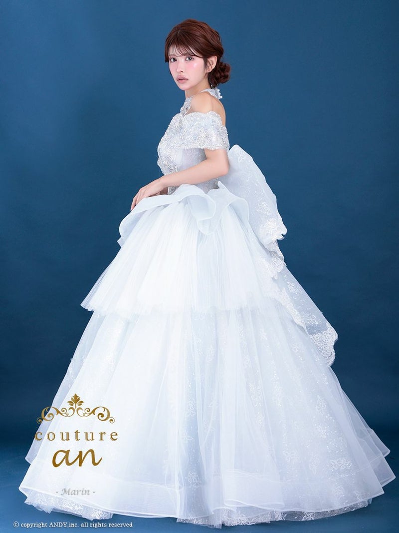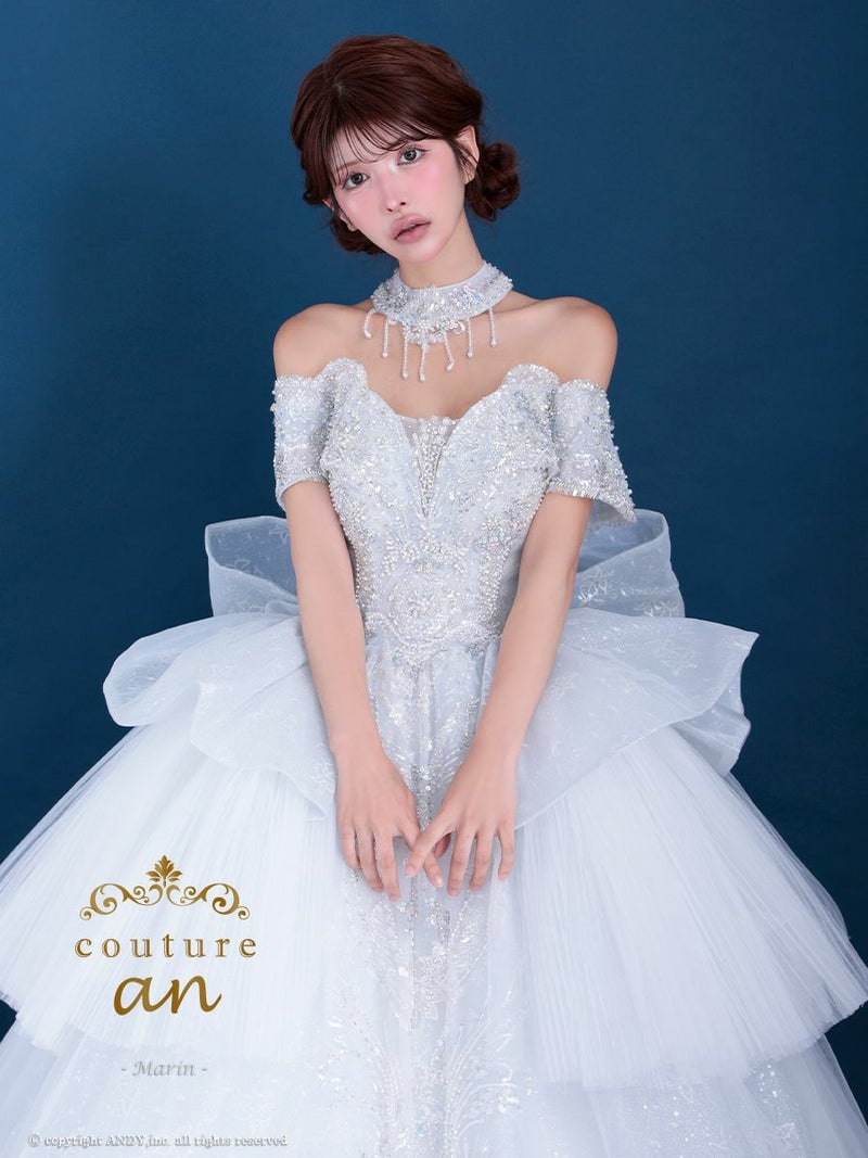 5. [couture an/クチュールアン] 高級 バースデー オフショルダー スパンコール ビッグリボン チョーカー ビーズ ゴージャス Aラインロングドレス