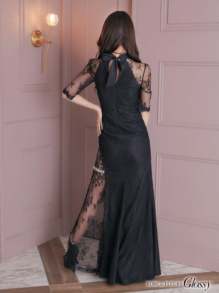 6. [ROBEdeFLEURSGlossy/ローブドフルールグロッシー] 高級ハイネックフロントジップサイドチュール切替袖ありタイトロングドレス