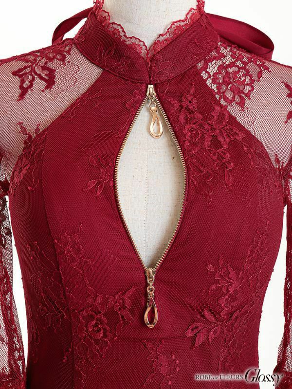 大胆なセクシーな一着☆ [ROBEdeFLEURSGlossy/ローブドフルールグロッシー] 高級ハイネックフロントジップサイドチュール切替袖ありタイトロングドレス