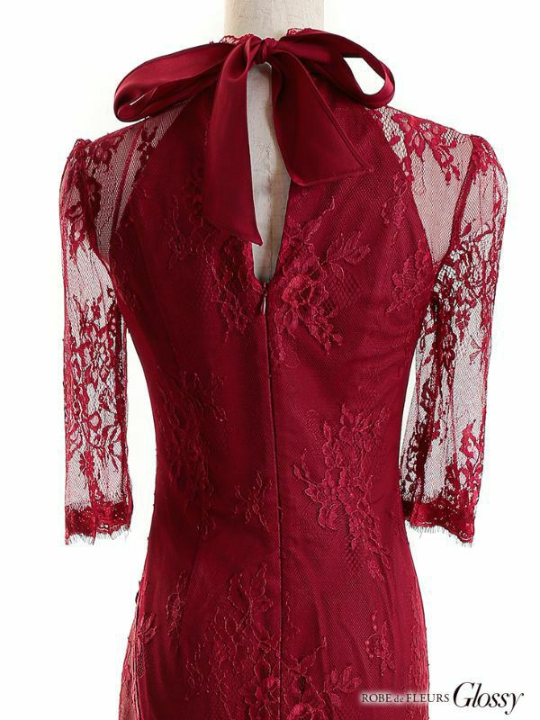5. [ROBEdeFLEURSGlossy/ローブドフルールグロッシー] 高級ハイネックフロントジップサイドチュール切替袖ありタイトロングドレス