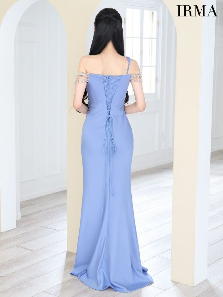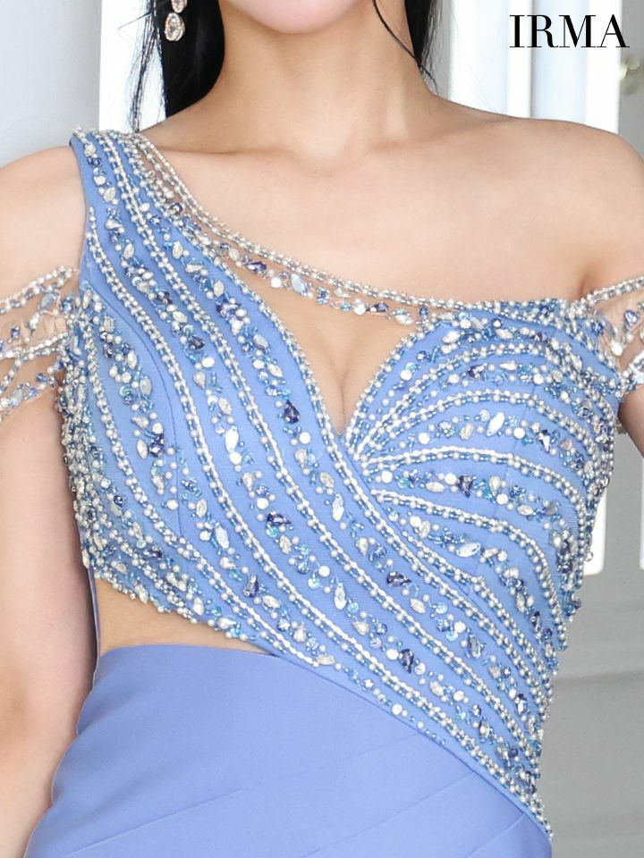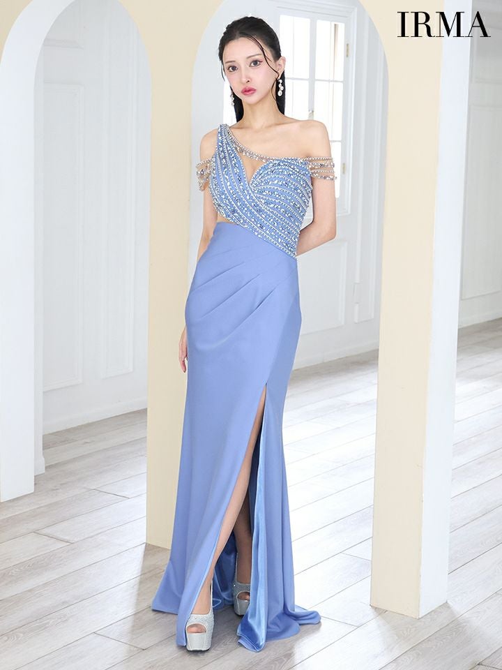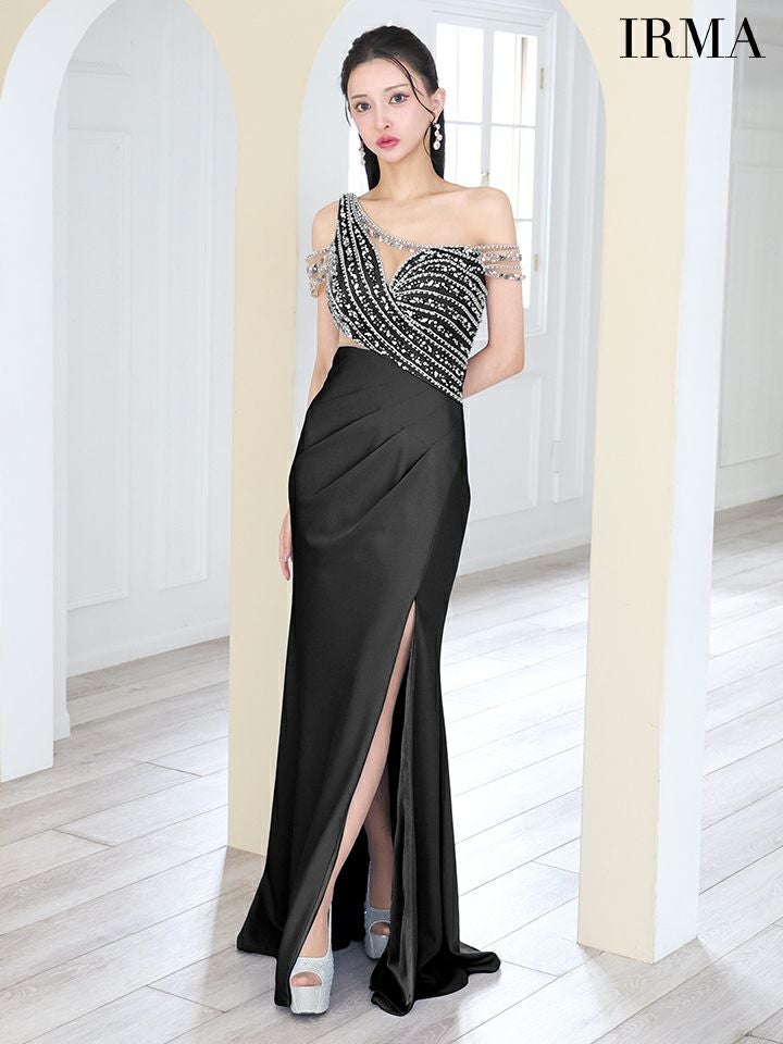 ラグジュアリーな輝きを纏う☆ [IRMA/イルマ] 高級 バストシースルー ビジュー タック ワンショルダー 谷間魅せ タイトロングドレス