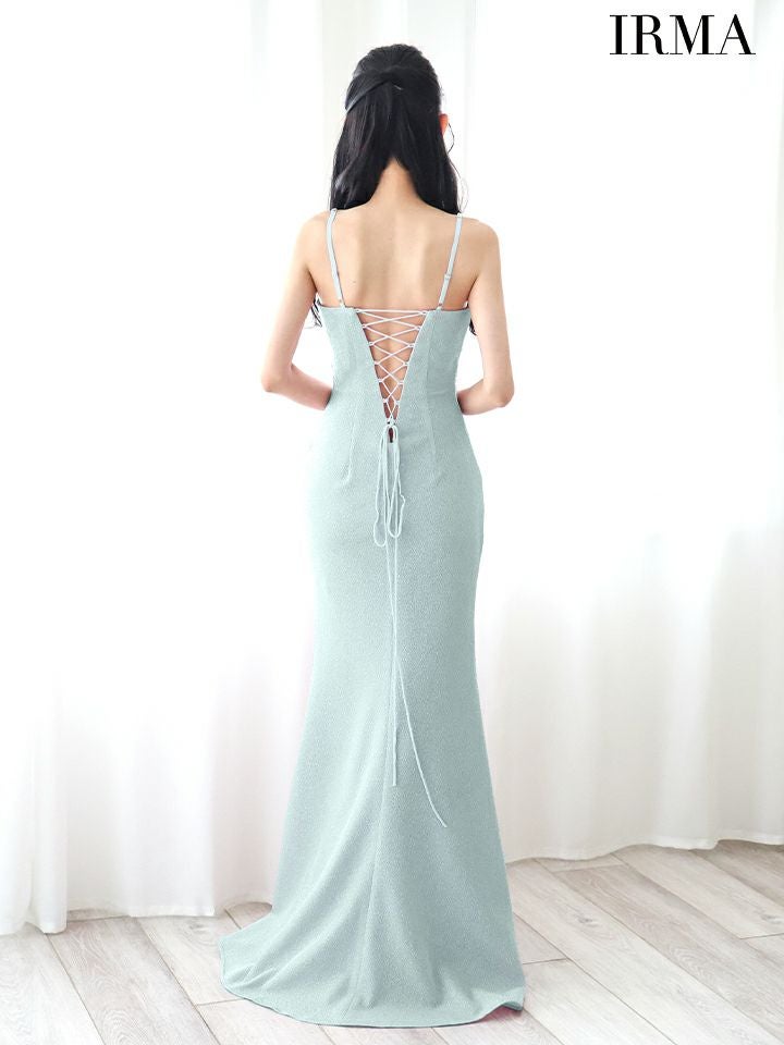 レースアップで大胆に背中魅せ☆ [IRMA/イルマ] 高級 キャミソール ラメニット バストカット ビジュー シアースリット タイトロングドレス