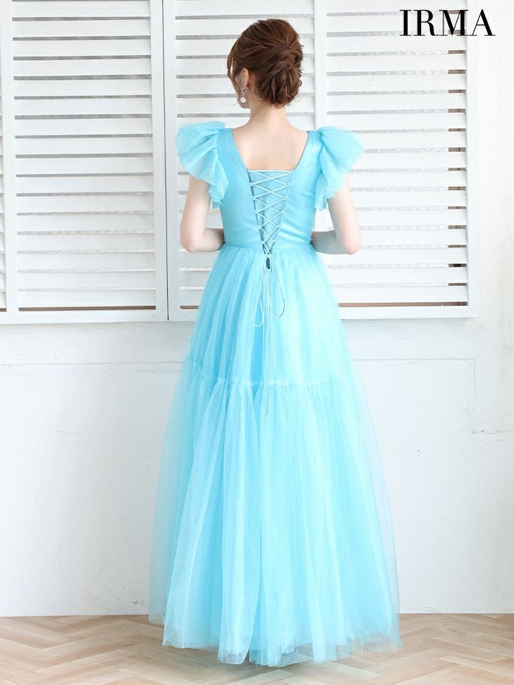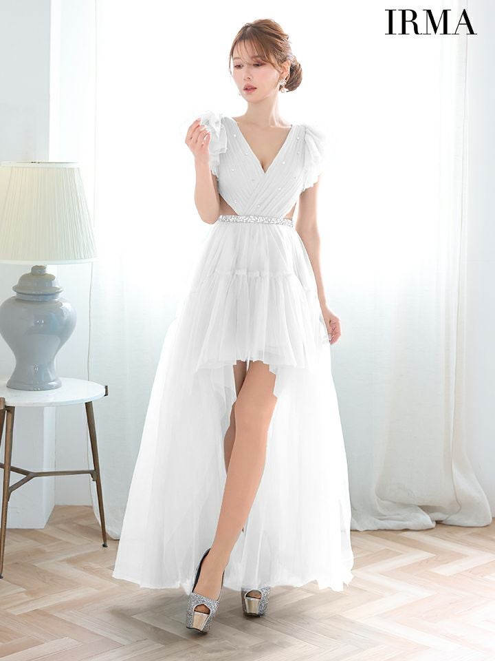 4. [IRMA/イルマ] 高級 バースデー フリル袖 Vネック 谷間魅せ ノースリーブ ビジュー ウエストカット チュール ロングテールドレス