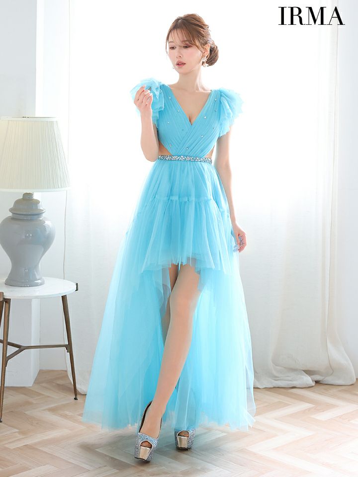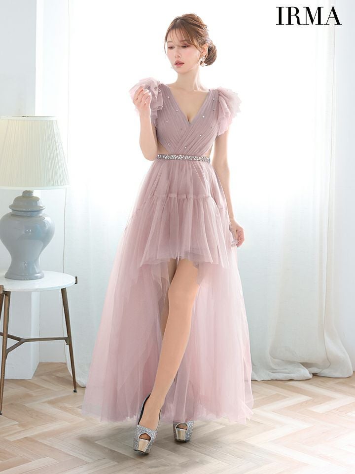 5. [IRMA/イルマ] 高級 バースデー フリル袖 Vネック 谷間魅せ ノースリーブ ビジュー ウエストカット チュール ロングテールドレス