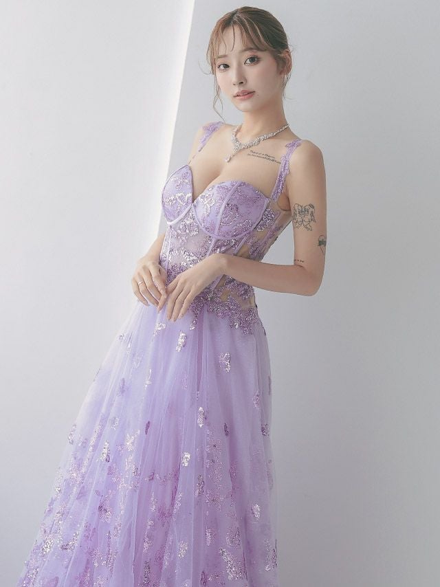 エレガントな雰囲気漂う♪ [LA直輸入] バースデー バタフライモチーフコルセット風デザインラメチュールキャミソールAラインロングドレス (Mサイズ~Lサイズ) (めぐりっぷ/キャバドレス着用)