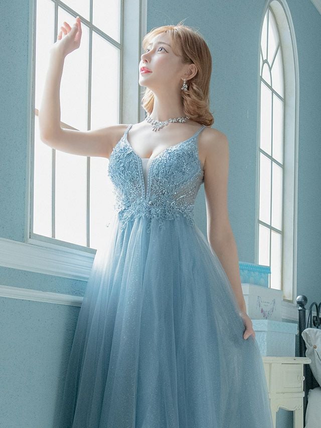 透明感たっぷりなふんわりエアリードレス♪ [LA直輸入] キャミソールゴージャス刺繍ビジューラメチュールAラインロングドレス (XSサイズ/Sサイズ) (明日花キララ/キャバドレス着用)