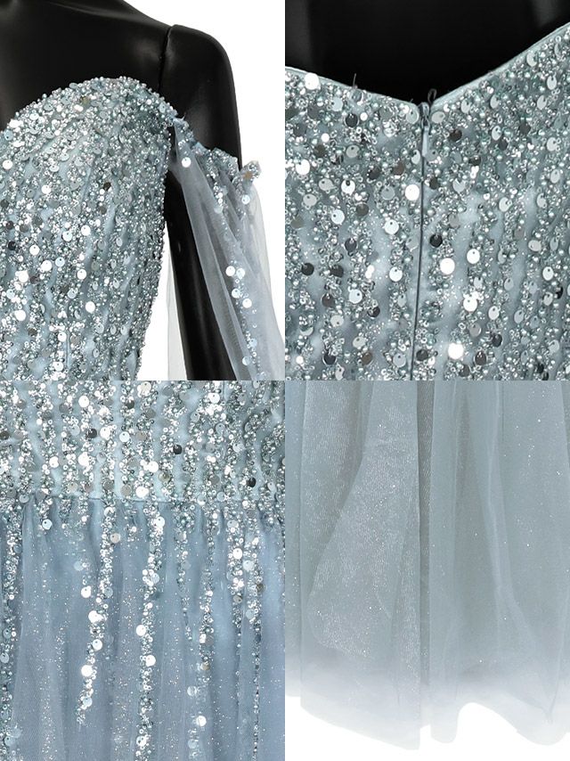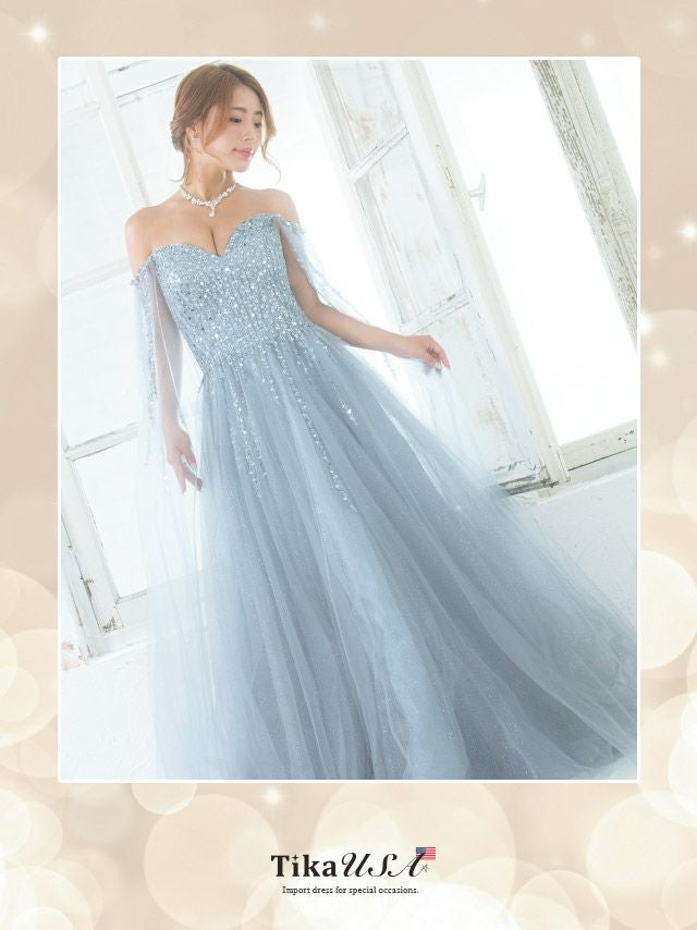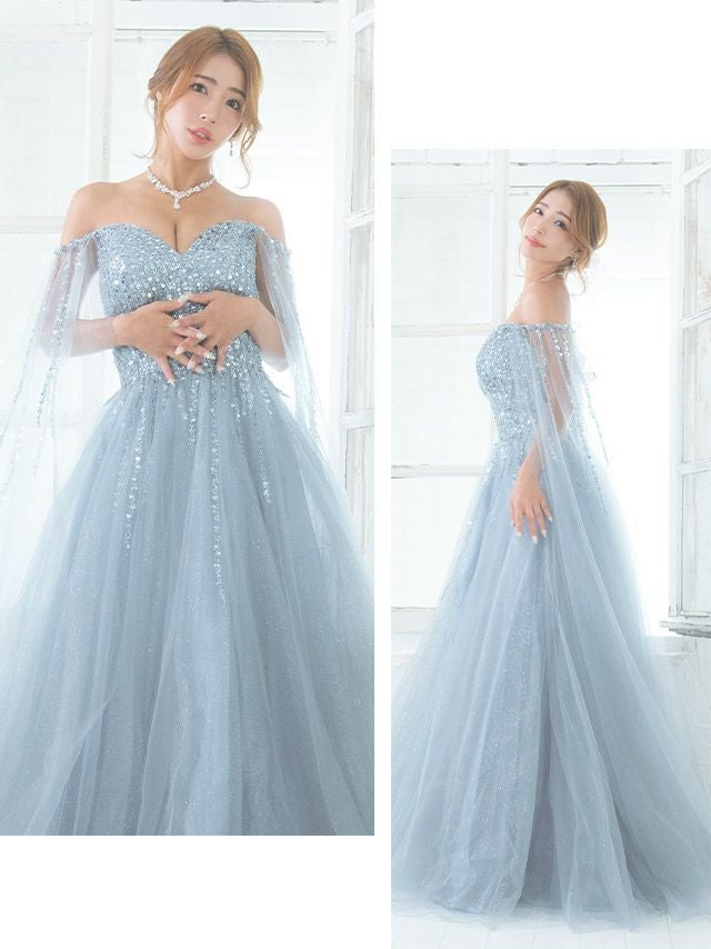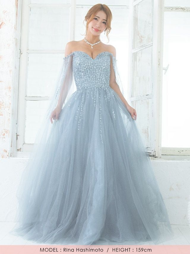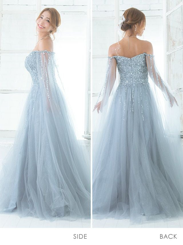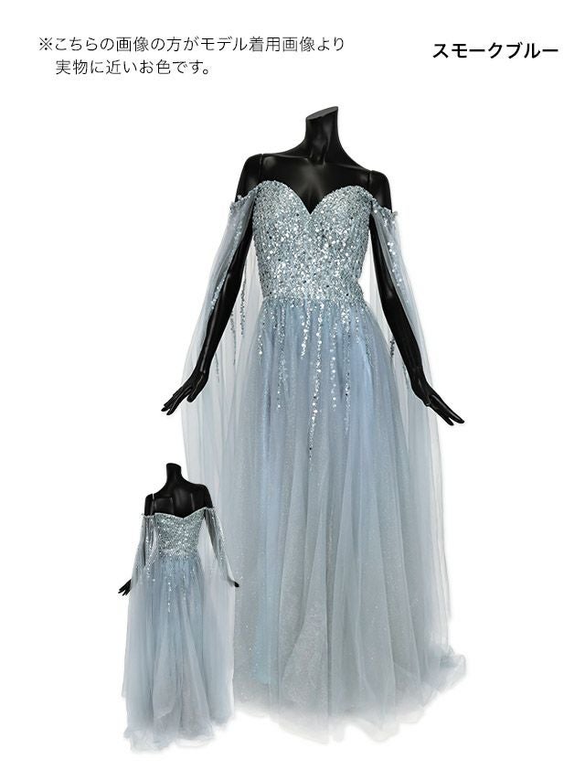 気になる手元を華やか&軽やかにカバー♪ [LA直輸入] バースデー ケープ風袖ありゴージャススパンコールラメチュールAラインロングドレス (Mサイズ) (橋本梨菜/キャバドレス着用)