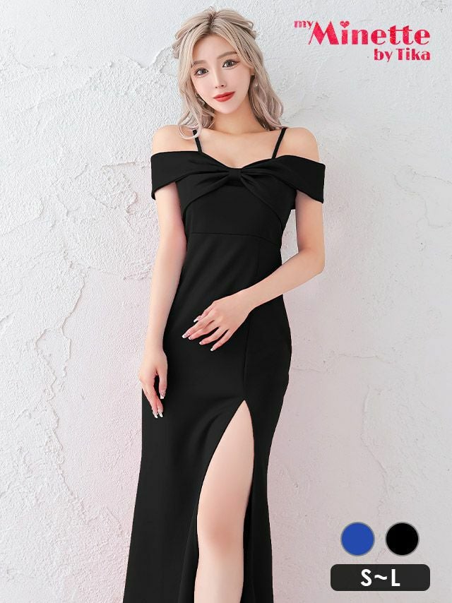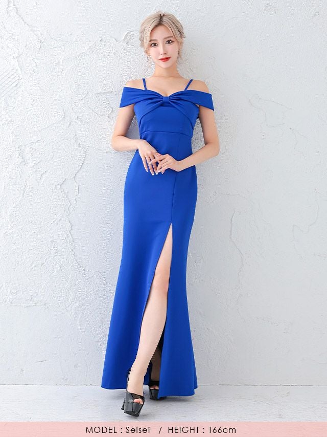 胸元リボンサイドスリット肩あきタイトロングドレス