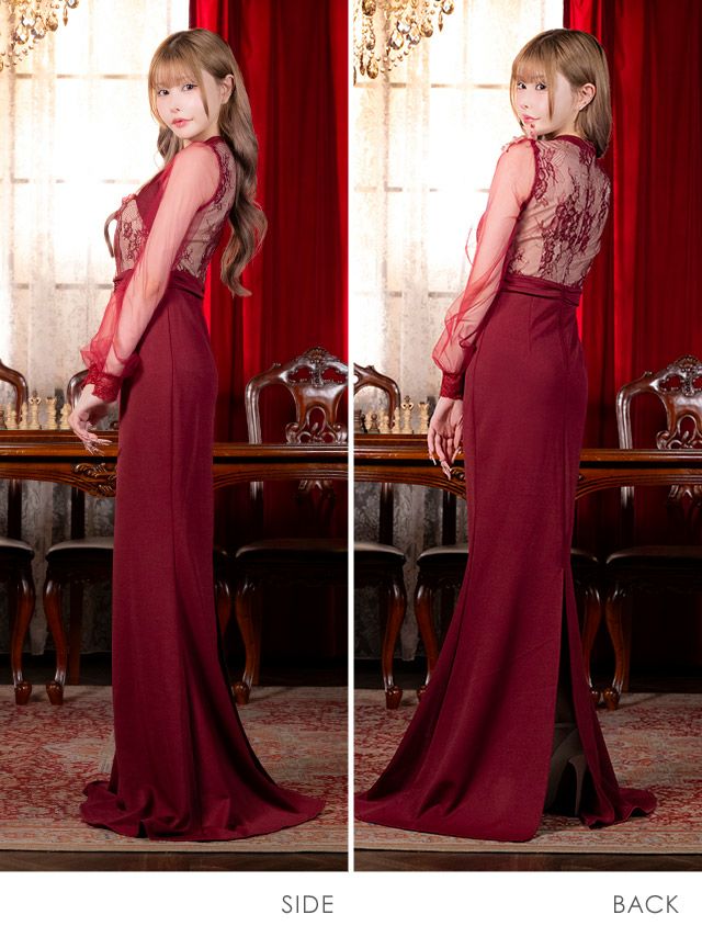 4. シアースリーブ 長袖 バストカット ヌーディーレース バックスリット ストレッチ タイトロングドレス (Sサイズ~XXXLサイズ) (戦慄かなの/キャバドレス着用)