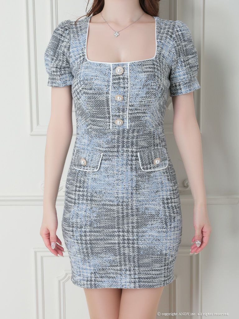 キャバドレス Andy アンディ 高級スクエアネックツイード半袖タイトミニドレス