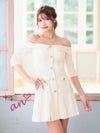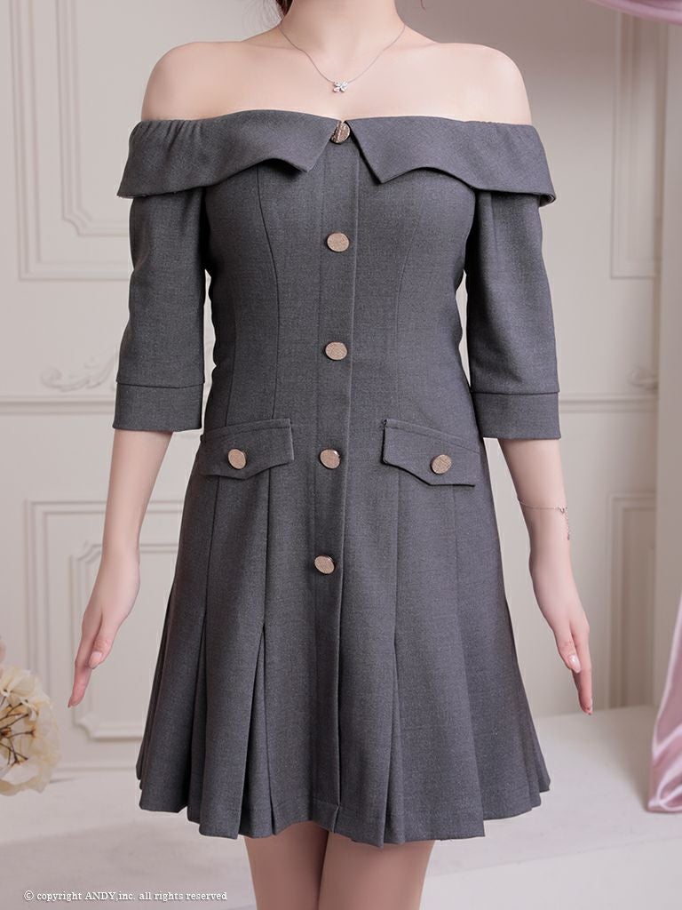 大人可愛いを演出☆ [an/アン] 高級袖ありオフショルダーゴールドボタンデザインプリーツフレアミニドレス
