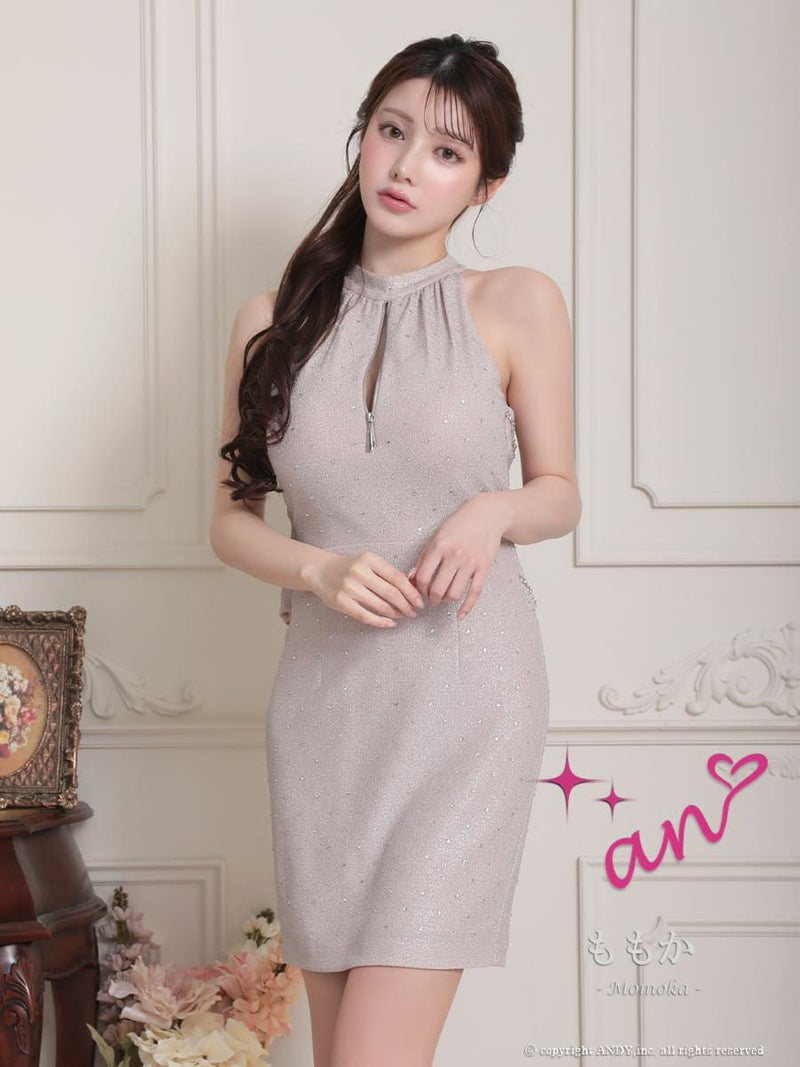 4. [an/アン] 高級ホルターネックビジューチェーンワンカラージップタイトミニドレス