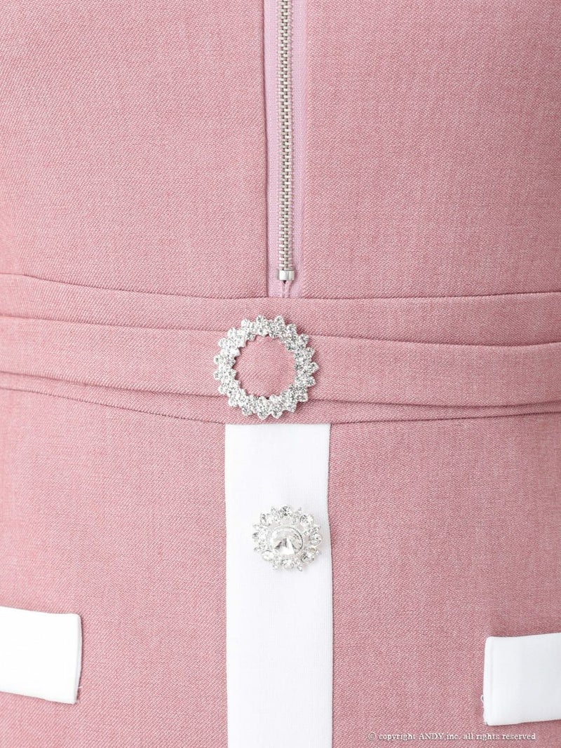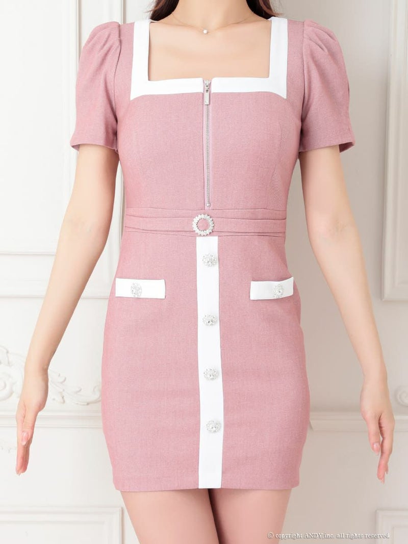 5. [an/アン] 高級 半袖 スクエアネック ジップ バイカラー ウエストベルト タイトミニドレス