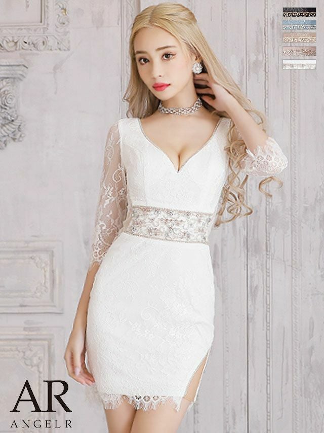 ビジューがラグジュアリーなアクセント☆ [Angel-R/エンジェルアール] 高級ウエストビジューラインレース袖ありVネックくびれタイトミニドレス