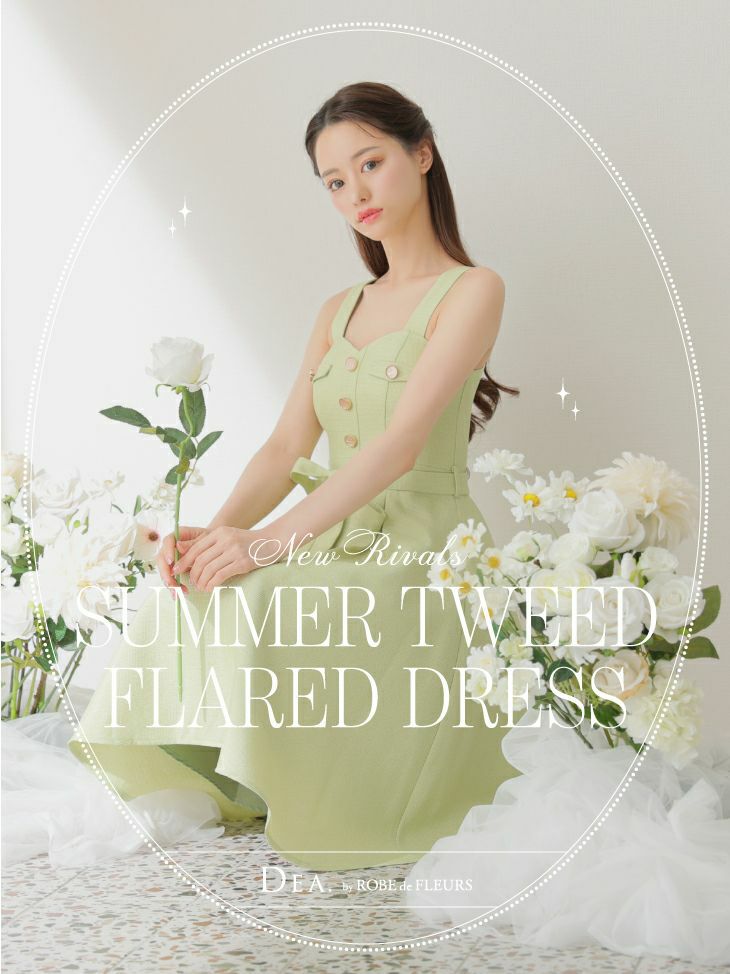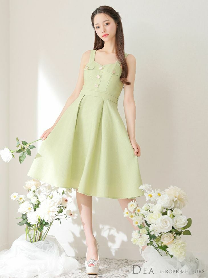 5. SALE [DEA.byROBEdeFLEURS/ディアバイローブドフルール] 高級ベルト付きハートカットフロントボタンツイードノースリーブフレア膝丈ドレス