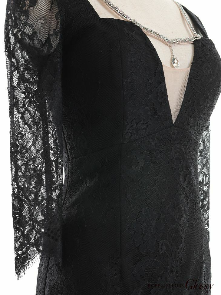 5. [ROBEdeFLEURSGlossy/ローブドフルールグロッシー] 高級 総レース バストシースルー ビジュー 袖あり 谷間魅せ タイトミニドレス