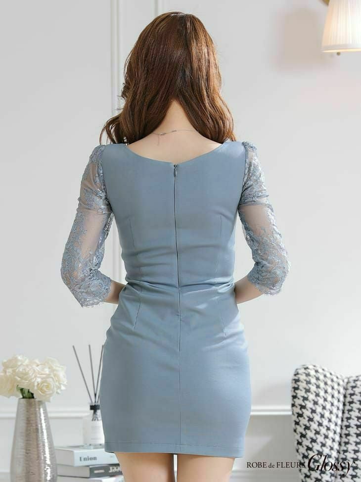 4. [ROBEdeFLEURSGlossy/ローブドフルールグロッシー] 高級 バストカット レース 袖あり クロスビジュー 谷間魅せ タイトミニドレス