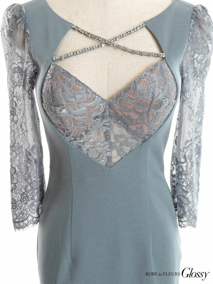 大胆バストカットでセクシーに☆ [ROBEdeFLEURSGlossy/ローブドフルールグロッシー] 高級 バストカット レース 袖あり クロスビジュー 谷間魅せ タイトミニドレス