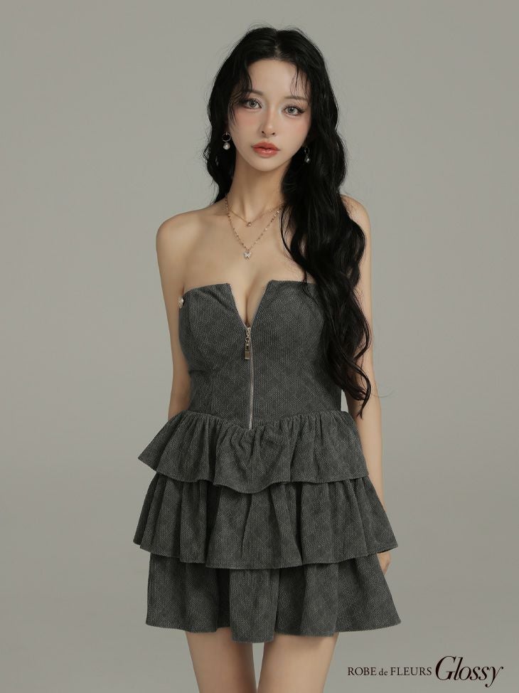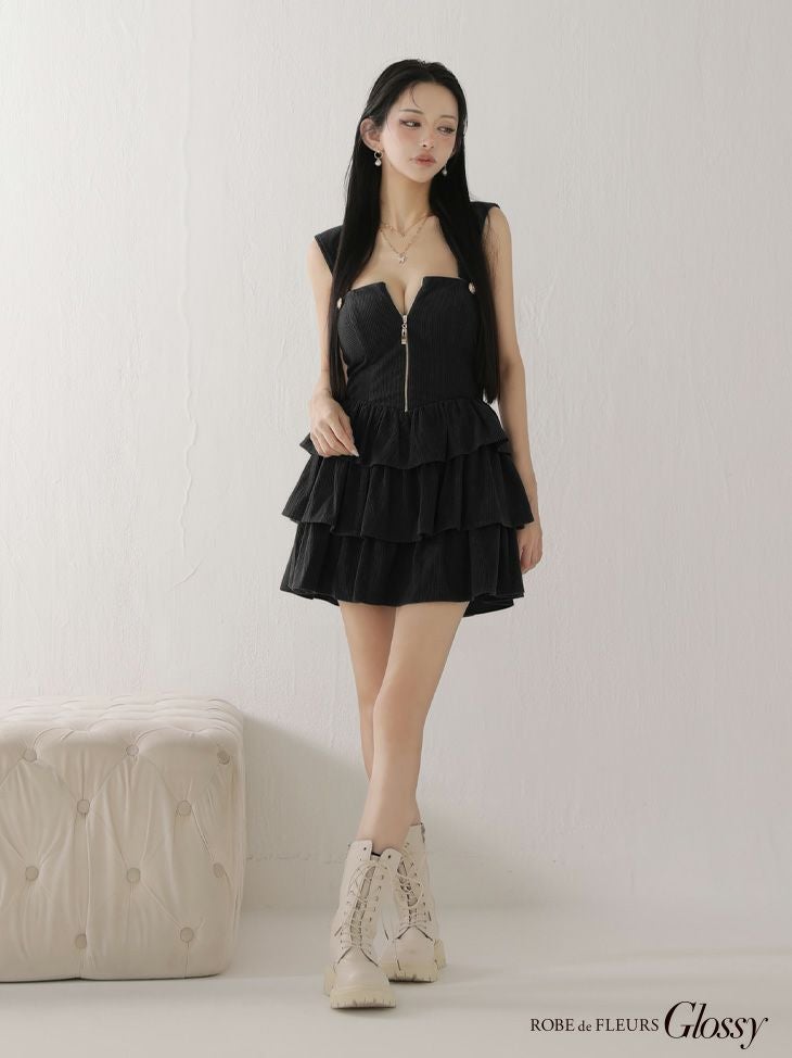 ティアードフリルで可愛く細見え♡ [ROBEdeFLEURSGlossy/ローブドフルールグロッシー] 高級 ブランド Aラインミニドレス ノースリーブ 谷間 チェック柄 ジップ 2way ベアデザイン フーディー ティアードフリル