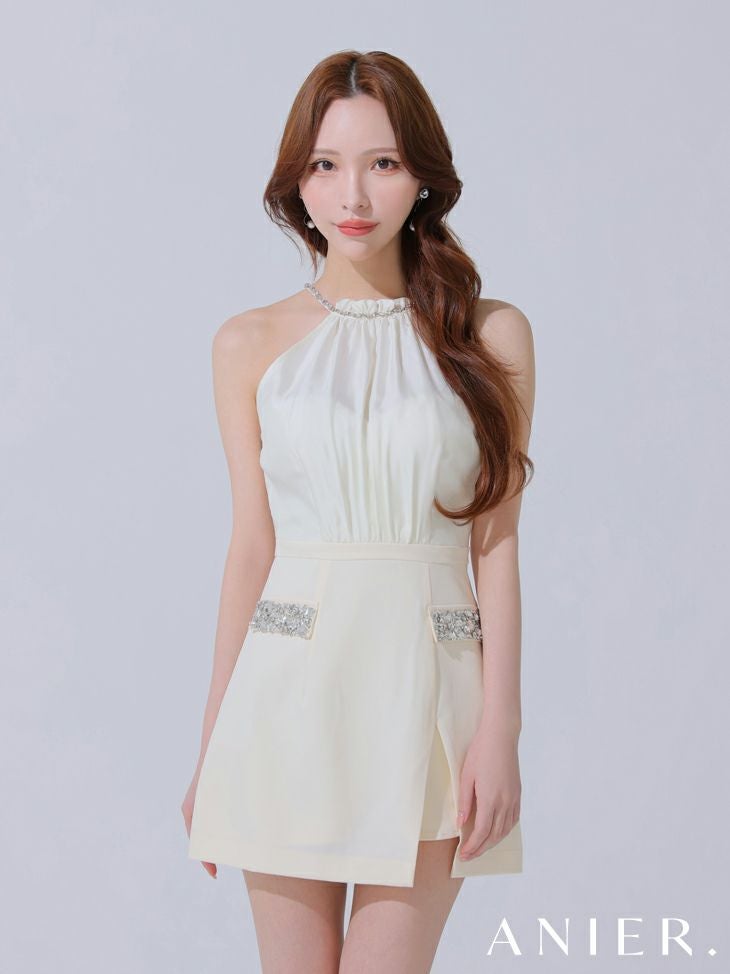 大胆な背中魅せで魅了する♡ [ANIER./アニエル] 高級 ブランド タイトミニドレス 背中魅せ ホルターネック スリット サテン バストシースルー ビジュー