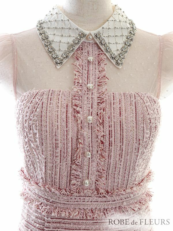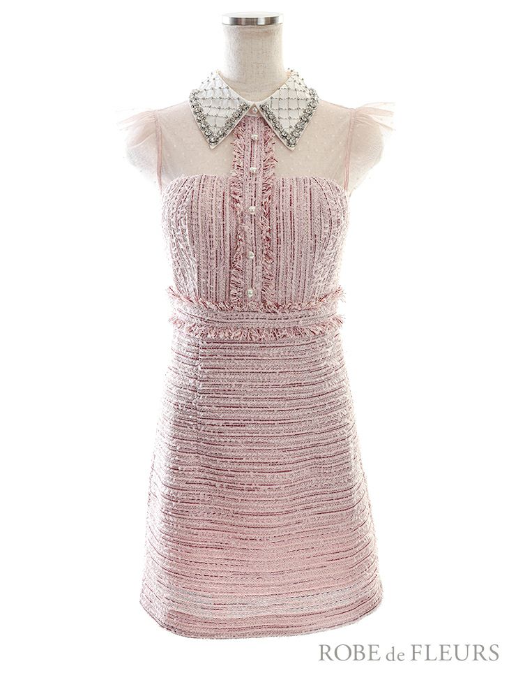 ビジュー付きの襟元がガーリー☆ [ROBEdeFLEURS/ローブドフルール] 高級 ラメツイード ビジュー 襟付き フリル袖 ノースリーブ 台形 ワンピース フレアミニドレス