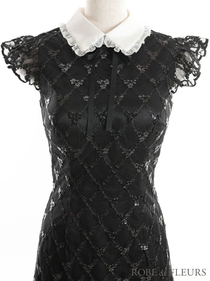 5. [ROBEdeFLEURS/ローブドフルール] 高級 ビーズレース ネックリボン 襟付き フリル袖 ノースリーブ フレアミニドレス