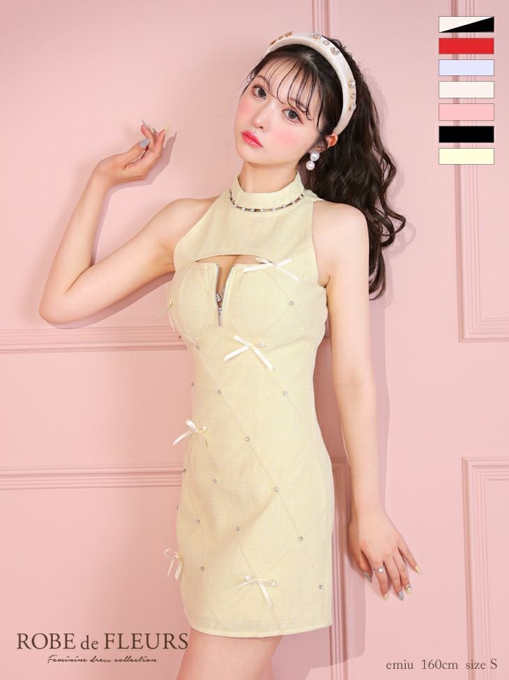 キャバドレス ミニドレス ROBEdeFLEURS ローブドフルール 高級ホルターネックキルティングリボンバストカットジップフレアミニドレス