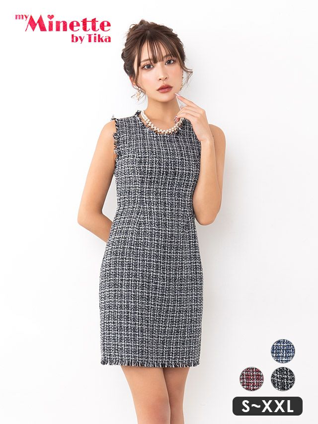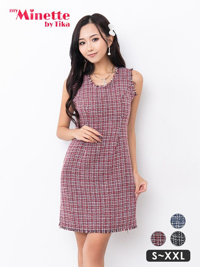 高級感漂う大人レディに♪ ノースリーブツイード裾フリンジタイトミニドレス (ちぴたん着用)