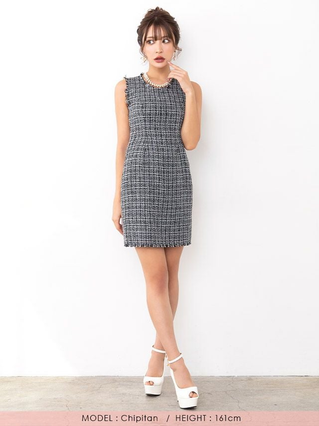 ノースリーブツイード裾フリンジタイトミニドレスのメイン画像