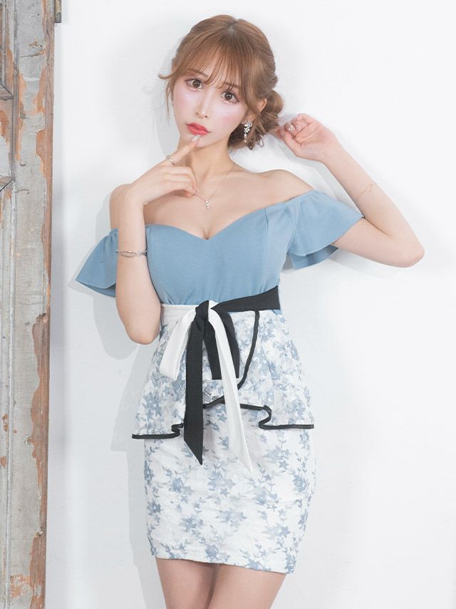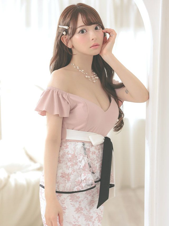 4. 2Wayオフショルダーフリル袖ウエストリボンペプラム切り替えフラワーレースパイピングタイトミニドレス (Sサイズ~XXXLサイズ) (浦西ひかる/キャバドレス着用)