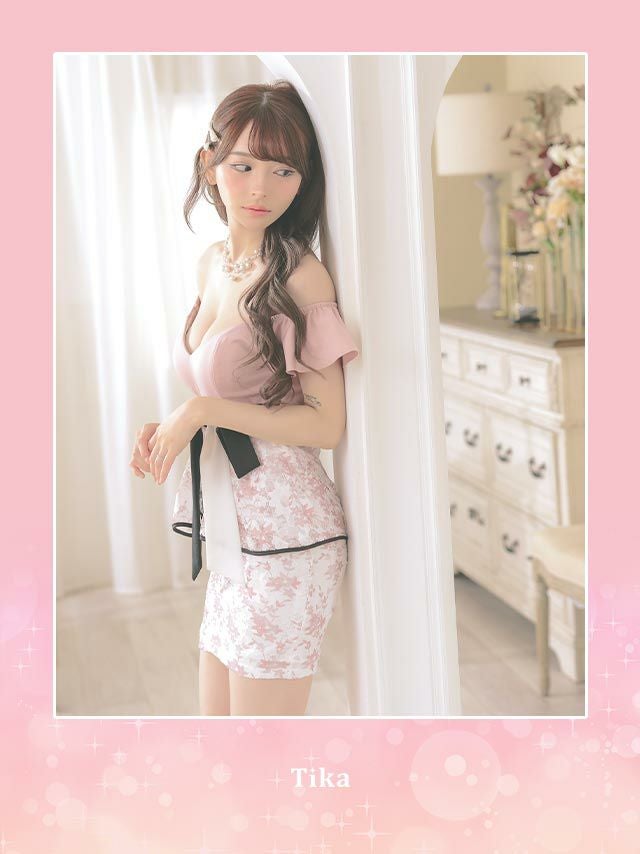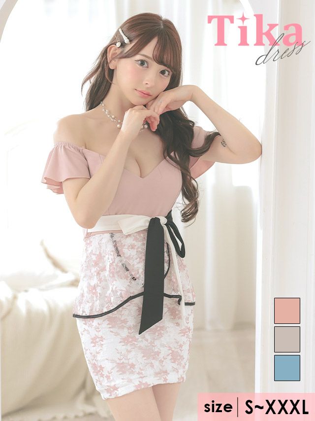 キャバドレス ミニ丈 大きいサイズ キャバクラ 体型カバー Tika ティカ 2Wayオフショルダーフリル袖ウエストリボンペプラム切り替えフラワーレースパイピングタイトミニドレス