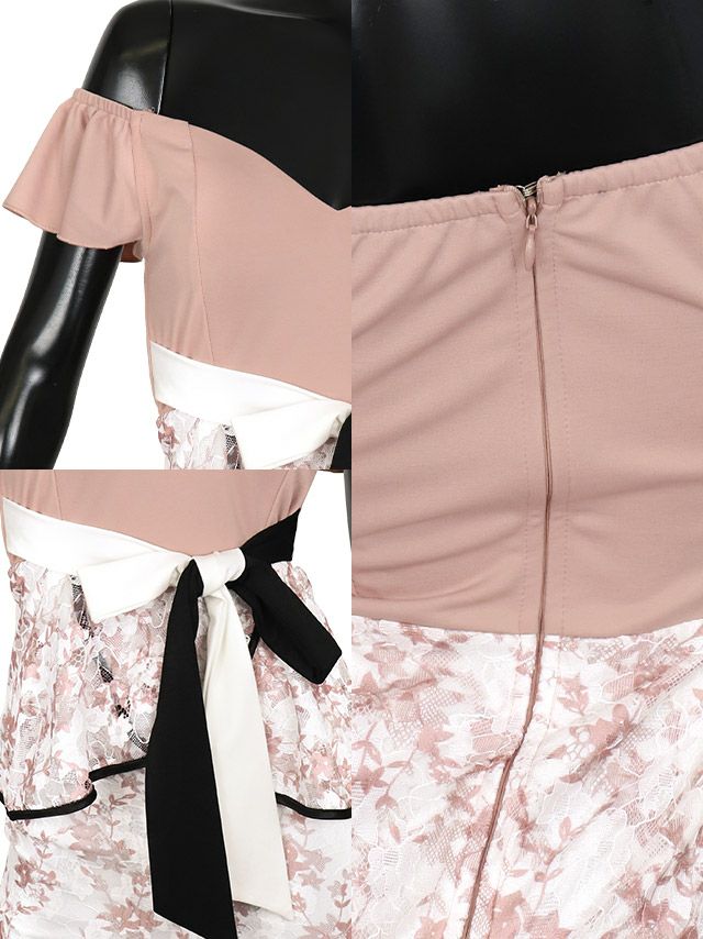 2Wayオフショルダーフリル袖ウエストリボンペプラム切り替えフラワーレースパイピングタイトミニドレス (Sサイズ~XXXLサイズ) (浦西ひかる/キャバドレス着用)
