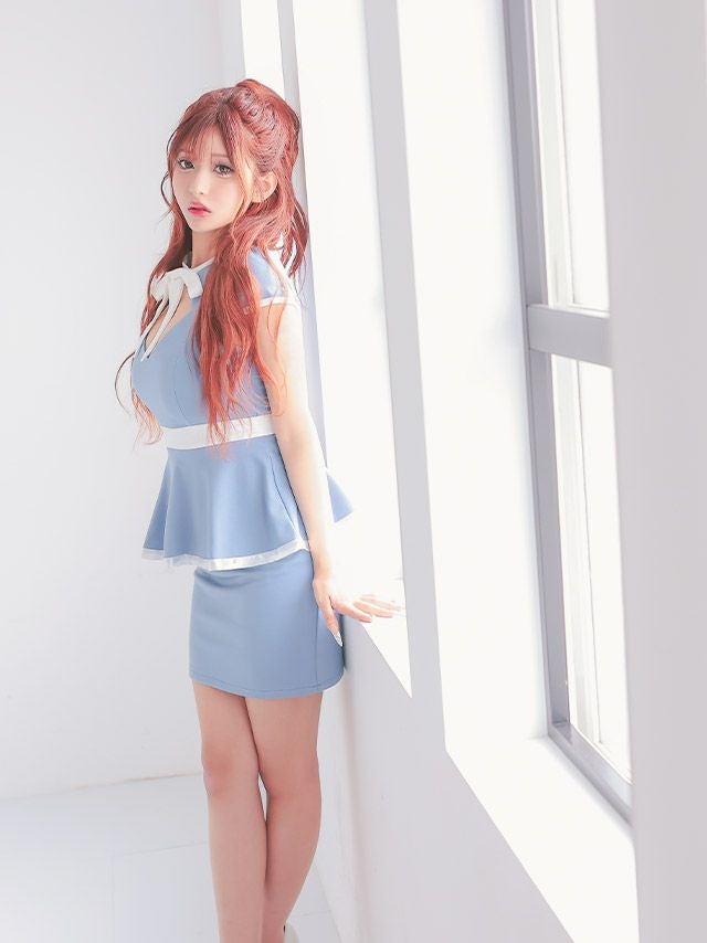 3. ミニドレス タイト 谷間 大きいサイズ ストレッチ 半袖 ペプラム ネックリボン ブラジャーのまま パイピング バストカット ブルー XL XXL 4L 5L 6L キャバドレス (横田未来着用) 【tk-md1283-h】