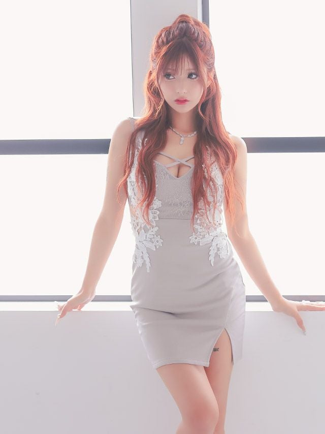 フラワー 刺繍 スリット クロスネック ノースリーブ タイト ミニ ドレス