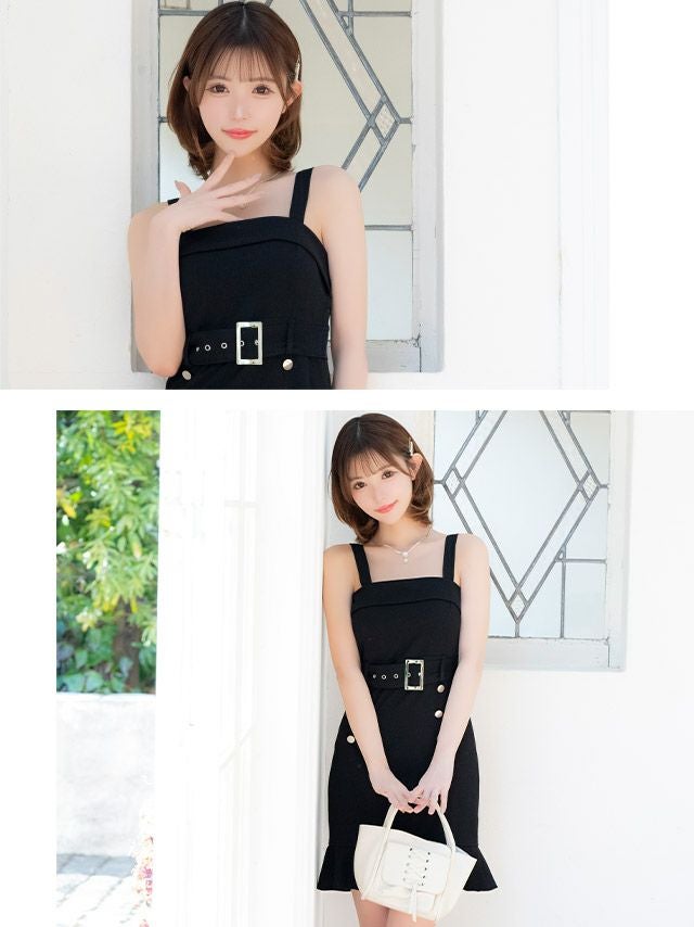 3. [SALE] ウエストベルト付きキャミソールダブルボタンワンカラー裾フリルタイトミニドレス (Sサイズ~XLサイズ) (せいせい/キャバドレス着用)